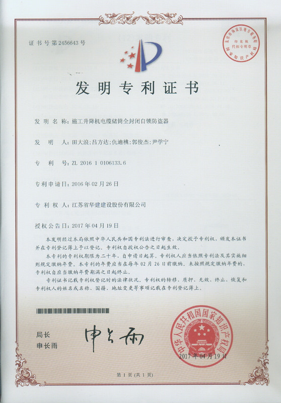 我公司又獲得一項國家發(fā)明專利授權(quán) 時間:2017-06-02 4193 日前,公司又一項發(fā)明專利獲得國家知識產(chǎn)權(quán)局授權(quán),此項專利名稱為“施工升降機電纜儲筒全封閉自鎖防盜器”,專利號為ZL 2016 1 0106133.6。 至此,公司已有22項發(fā)明專利入賬。