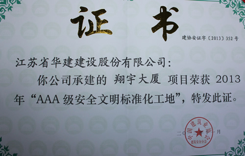 公司首獲全國“AAA級安全文明標準化工地” 時間:2013-12-12 5257 日前,由上海區域公司蘇北分公司承建的淮安翔宇大廈被中國建筑業協會評為2013年全國“AAA級安全文明標準化工地”,這是國內安全文明施工最高獎項,旨在規范建筑施工安全生產,保障建筑職工安全與健康,提高施工現場安全管理水平。這是上海區域公司第一次獲此殊榮,也是江蘇華建第8項全國3A級安全文明標準化工地,該工程還被評為2012年度江蘇省建筑施工文明工地、2013年度江蘇省建筑業新技術應用示范工程。