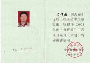 該同志先后擔任過多項工程的項目經理,施工中所體現出的管理水平、協調能力、進度控制贏得了主管部門和甲方的高度評價。尤其值得一提的是,石偉國擔任深圳市最大商住樓工程——深圳紅樹西岸(建筑面積35萬平方米)項目經理期間,精心組織,精心施工,精心管理,創出優良的工程質量,工地成為業內外進行觀摩學習的重要基地,前來參觀者絡繹不絕,人數逾3000人次,都深深嘆服于有口皆碑的工程質量。該工程在2004年度深圳市上半年度工程質量、安全生產文明施工檢查中獲第一名,被評為廣東省、深圳市“雙優”、深圳市金牛獎、江蘇省“揚子杯”、廣東省“金匠獎”,2008年度問鼎全國建設工程最高質量榮譽魯班獎。