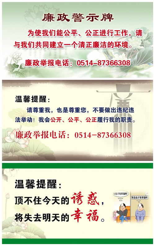 近年來,隨著公司轉(zhuǎn)型升級發(fā)展加快,房地產(chǎn)開發(fā)、污水處理、BT等靈活投資方式日益增多,公司黨委非常重視投資項目廉政建設(shè),為從源頭上預(yù)防和堅決遏制公司投資項目建設(shè)過程中違法違紀(jì)行為的發(fā)生,決定由紀(jì)委、監(jiān)察室總負(fù)責(zé),對投資項目實施監(jiān)察,實行工作前移、過程監(jiān)督,并出臺相關(guān)實施辦法。監(jiān)察工作具體由公司紀(jì)檢監(jiān)察室負(fù)責(zé),除加強廉潔從業(yè)教育和相關(guān)法律法規(guī)教育外,重點督促和檢查各項工作制度的建立和落實,與相關(guān)方簽訂《廉政責(zé)任書》、《廉政合同》,對重點環(huán)節(jié)進(jìn)行督查,確保廉政責(zé)任與經(jīng)營責(zé)任同步實施,同時在辦公場所和項目現(xiàn)場設(shè)置醒目的廉政警示牌,公布舉報電話,及時處理人民來信來訪,查處違紀(jì)違規(guī)行為。12月中下旬,公司黨委副書記、監(jiān)事會主席吳士茂和黨委委員、紀(jì)委書記錢啟明及黨委委員、副總經(jīng)理程杰等領(lǐng)導(dǎo)先后赴鹽城華建置業(yè)、揚州華盛置業(yè)開展廉政教育,組織全體員工舉行莊重的廉潔從業(yè)宣誓儀式,并與相關(guān)方簽訂《廉政責(zé)任書》和《廉政合同》,希望公司工作人員嚴(yán)以律己、廉潔從業(yè),并希望相關(guān)方理解和支持,共同打造優(yōu)質(zhì)工程、品牌工程、廉政工程。