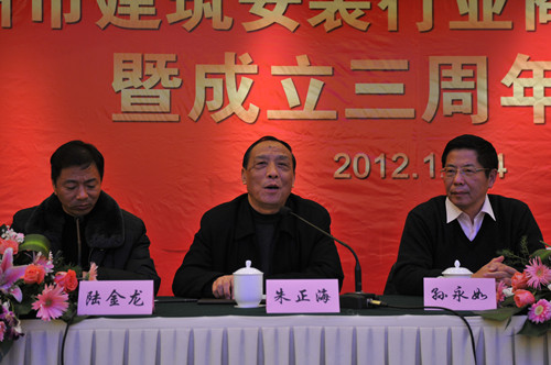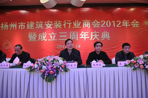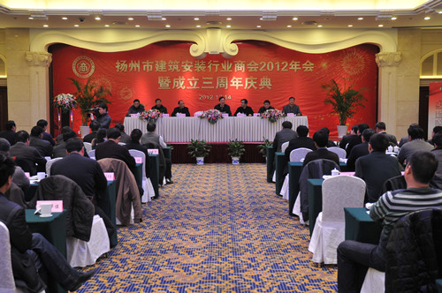 12月14日下午,揚州市建筑安裝行業商會在揚州西園飯店舉辦2012年會暨成立三周年慶典大會,市人大副主任、市工商聯主席、市總商會會長孫永如,市政府副市長聞道才,市政協原副主席、市建安商會名譽會長朱正海,市工商聯黨組書記、副主席、市總商會副會長趙振東,市工商聯副主席吳鈞等領導出席,市城建局、民政局、工商聯相關部門負責人,相關兄弟商會、協會負責人以及建安商會所有會員單位負責人等近120人參加會議,市建安商會會長陸金龍主持。