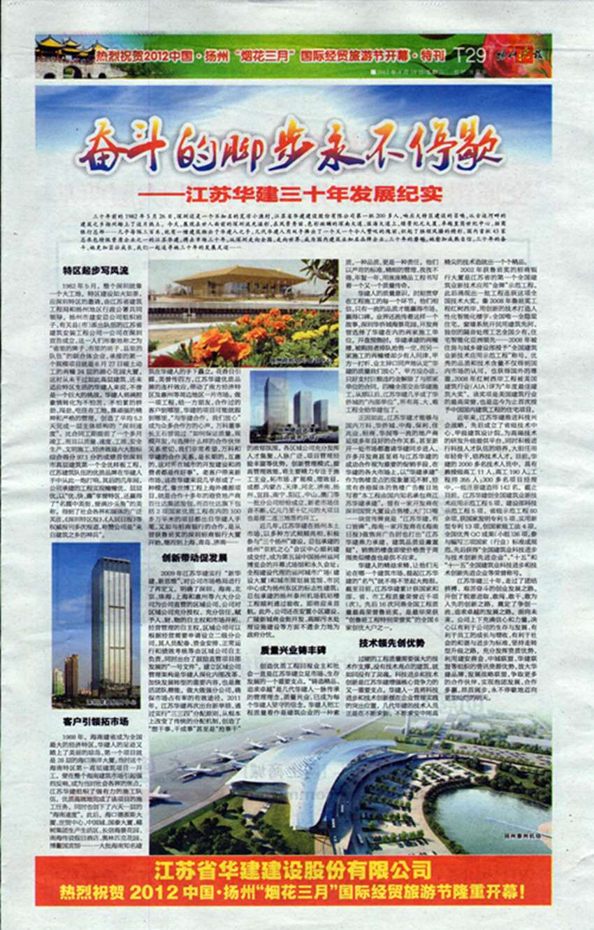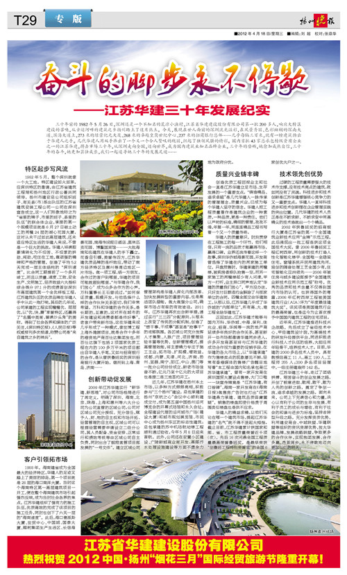 《揚州晚報》專版刊發公司三十周年宣傳文章 時間:2012-04-19 5421 4月18日,《揚州晚報》T29版刊發專版文章《奮斗的腳步永不停歇——江蘇華建三十年發展紀實》,從公司起步、市場開拓、創新發展、質量與科技等各個層面,介紹了公司三十年的奮斗歷程、綜合實力和發展業績。