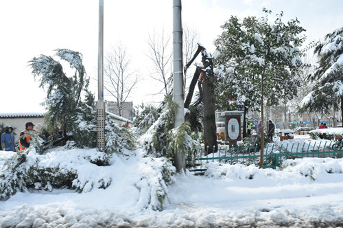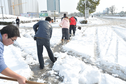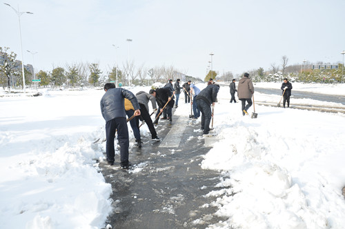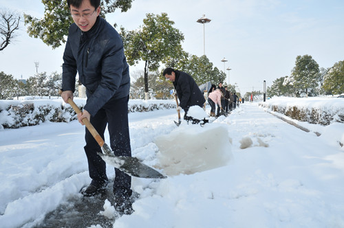 公司總部組織員工上路清掃積雪 時間:2013-02-19 3852 2月18日至19日凌晨,揚州出現低溫降雪災害天氣,降下了多年罕見的一場大雪,壓垮樹枝和部分房屋設施,并造成道路交通不便。19日清晨,公司響應市政府號召,組織20余名員工上路清掃積雪,公司領導吳士茂、錢啟明親自參加,與大家共同會戰2個多小時,完成了清掃任務。 厚重的積雪壓垮樹枝