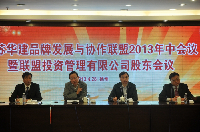 4月28日,江蘇華建品牌發展與協作聯盟2013年中會議暨聯盟投資管理有限公司股東會議在揚州召開,19個聯盟成員、4個聯盟觀察員單位負責人和聯盟投資管理公司全體股東及經營層參加會議,江蘇華建副董事長、總經理宗有農主持會議,聯盟主席陸金龍作了講話,揚州市人民政府副市長聞道才、副秘書長侯承海出席會議。