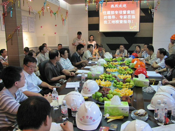 9月18日上午,國家住房城鄉(xiāng)建設(shè)部建筑施工安全專項督查組蒞臨我公司廣西麗原·天際城工地檢查指導(dǎo)工作,勘察了施工現(xiàn)場的實體安全狀況,查閱了施工質(zhì)量安全技術(shù)資料,檢查了我公司的資質(zhì)、安全許可、三類人員與特種作業(yè)人員持證的情況。項目部的安全防護(hù)與文明施工工作受到了督查組的一致好評,住建部工程質(zhì)量安全監(jiān)管司王樹平副司長在知道我們爭創(chuàng)“魯班獎”的情況后,提出了許多寶貴的意見,并預(yù)祝我們的質(zhì)量目標(biāo)得以圓滿實現(xiàn)。