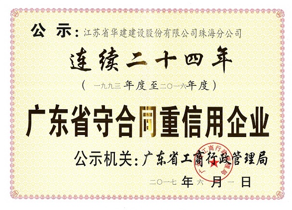 公司連續(xù)二十四年被廣東省工商行政管理局表彰為“守合同重信用企業(yè)” 時間:2017-07-03 4444 近日,珠海公司被廣東省工商行政管理局授予“連續(xù)二十四年守合同重信用企業(yè)”榮譽稱號。