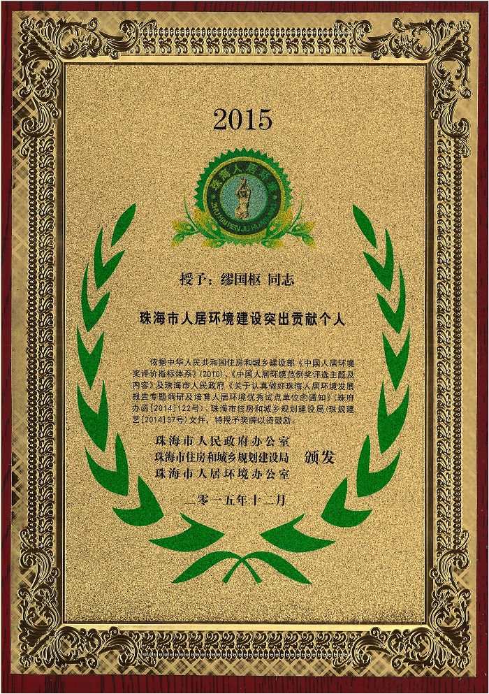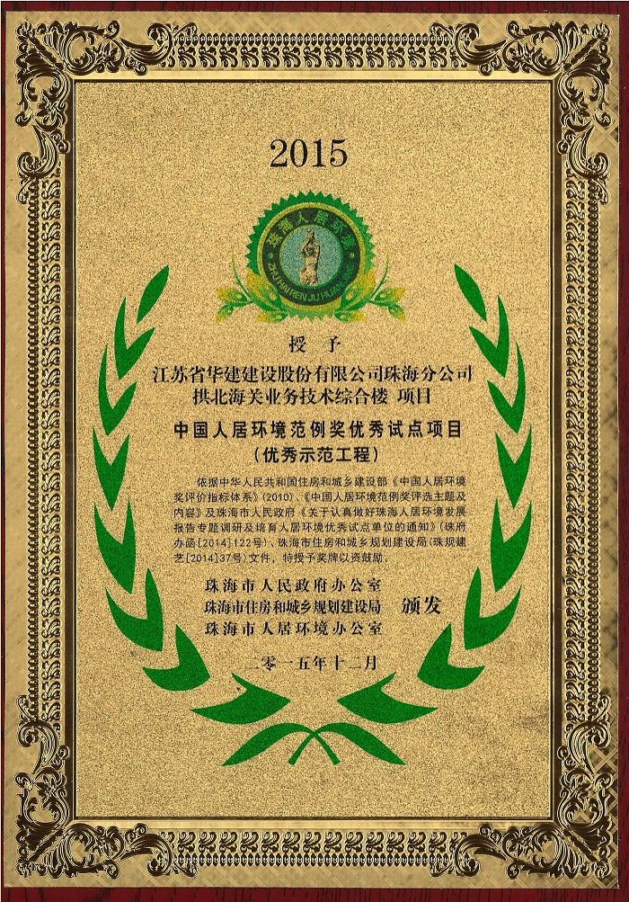 公司榮獲珠海市人居環境建設突出貢獻單位等四項表彰 時間:2015-12-22 4711 近日,珠海公司被珠海市人民政府辦公室、珠海市住房和城鄉規劃建設局和珠海市人居環境辦公室聯合表彰為珠海市人居環境建設突出貢獻單位(優秀建筑施工企業),繆國樞總經理被授予珠海市人居環境建設突出貢獻個人稱號,由我公司承建的拱北海關業務技術綜合樓及南福·錦園項目榮獲中國人居環境范例獎優秀試點項目(優秀示范工程)。