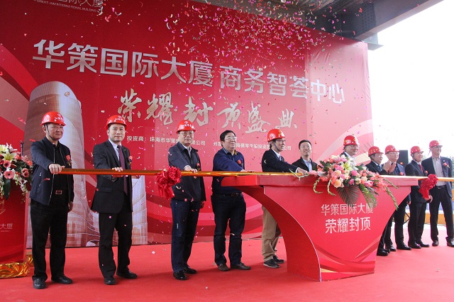 2017年1月9日,第八項目部承擔施工任務的華策國際大廈項目舉行主體結構封頂儀式。橫琴新區黨委副書記葉真、橫琴新區建設環保局局長劉晨光,華策集團董事局主席楊峰、副主席楊智雄、總裁余道群,江蘇華建副董事長、總經理宗有農、珠海公司總經理繆國樞、深圳公司常務副總吳碧橋、深圳公司副總經理蔣超,以及來自華策集團、設計單位、參建單位、監理單位和珠海區域公司相關人員共200余人出席儀式。華策國際大廈整體分為東塔和西塔兩部分,西塔已于2016年11月8日封頂,隨著東塔的順利封頂,華策國際大廈全面封頂,并將于2017年部分投入使用,2018年底全部投入使用。