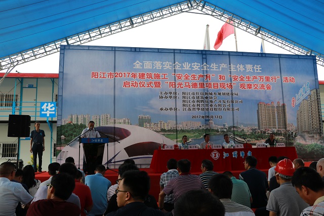 6月13日,2017年陽(yáng)江市建筑工程安全生產(chǎn)文明施工示范工地現(xiàn)場(chǎng)觀摩會(huì)在陽(yáng)江公司陽(yáng)光馬德里項(xiàng)目隆重舉行。陽(yáng)江市住房規(guī)劃建設(shè)局分管安全生產(chǎn)副局長(zhǎng),建管科、市質(zhì)安監(jiān)站全體人員,市建筑協(xié)會(huì)負(fù)責(zé)人,各縣(市、區(qū))住房規(guī)劃建設(shè)局分管安全生產(chǎn)副局長(zhǎng),建管股股長(zhǎng)、質(zhì)安監(jiān)站站長(zhǎng),市直各施工企業(yè)和監(jiān)理企業(yè)分管安全生產(chǎn)領(lǐng)導(dǎo)、質(zhì)安部門(mén)負(fù)責(zé)人,以及全市600余位建設(shè)施工企業(yè)代表參加大會(huì)并觀摩陽(yáng)光馬德里施工現(xiàn)場(chǎng)。
