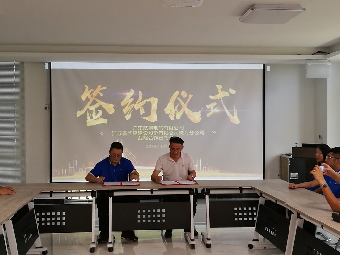 2019年6月15日,江蘇華建珠海分公司總經理呂方達與廣東航粵電氣有限公司董事長楊建豐分別代表雙方簽訂《戰略合作框架協議》。